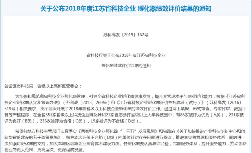 近日,江苏省科技厅公布了《2018年度江苏省科技企业孵化器绩效评价结果》(苏科高发〔2019〕162号),通过组织申报、初评推荐、专家评审等程序,矿大科技园获得了优秀(A类)的考核结果,这是矿大科技园连续三年获评优秀等级。