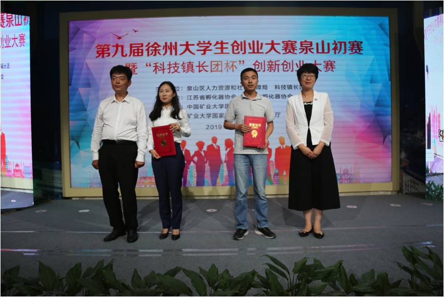 江苏奋斗服饰有限公司、徐州治鼎环境科技有限公司荣获一等奖,并由徐州市创业工作指导中心主任殷飞、泉山区副区长、科技镇长团团长沈学峰为其颁发获奖证书。