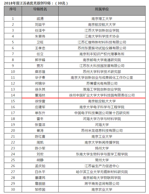 通过组织申报,经初评、网络中评和现场评审等一系列严格筛选,最终遴选出了30家“江苏省优秀双创品牌服务单位” 、10家“十佳双创品牌服务单位”,30位“江苏省优秀双创导师”。矿大科技园斩获双项荣誉,矿大科技园总经理董海林被评为“江苏省优秀双创导师”。