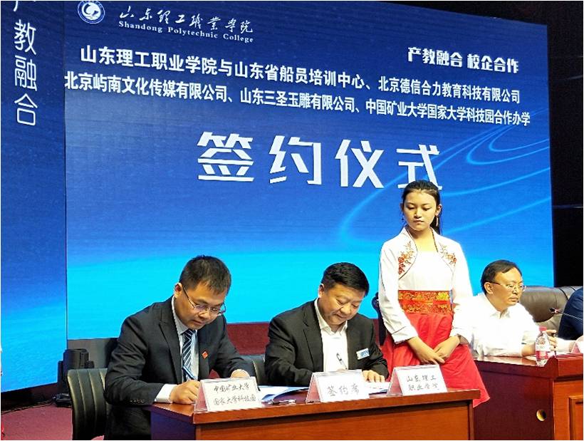 5月7日,在2018年济宁市职业教育周活动开幕式上,中国矿业大学国家大学科技园副总经理党建民与山东理工职业学院党委书记许可分别代表协议双方签署共建济宁太白湖新城大学科技园战略合作协议。济宁市市委常委、常务副市长于永生、市人大常委会副主任张玉华等领导见证签约。