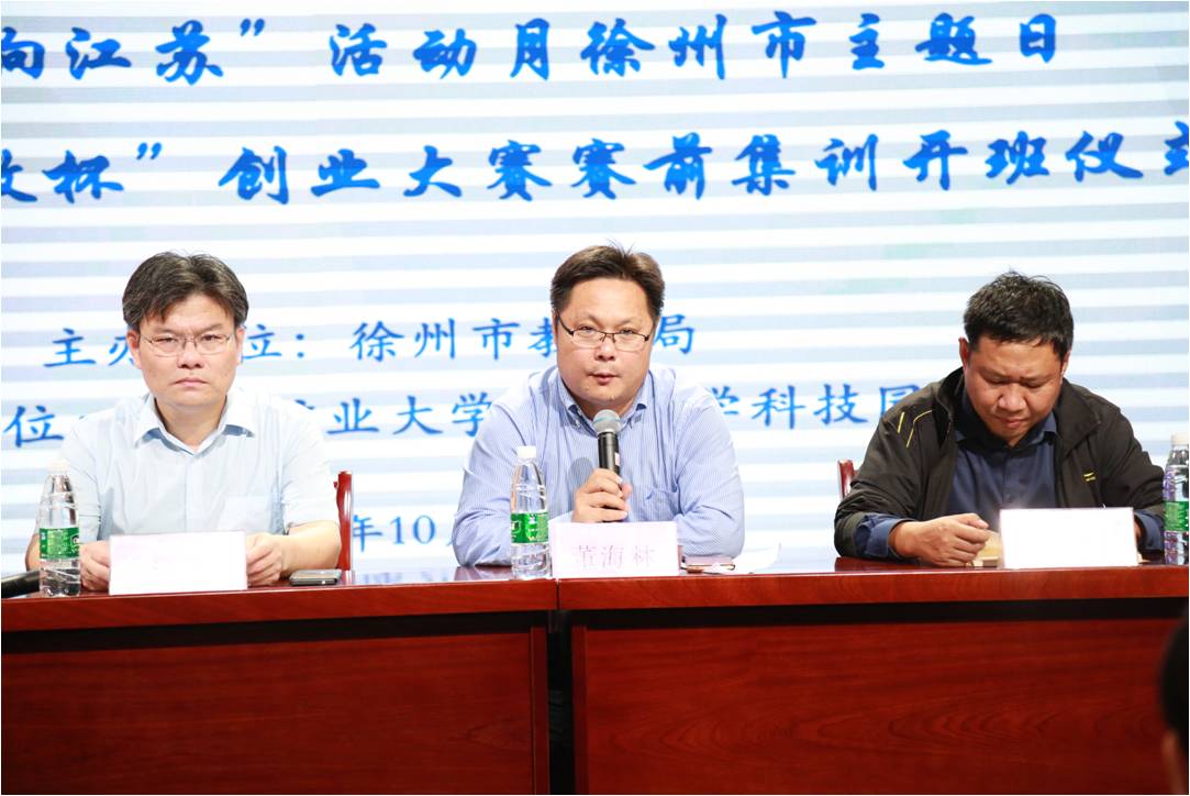 2017年10月9日上午9时,由徐州市教育局主办,中国矿业大学国家大学科技园承办的“梦起职教、创赢淮海”——“职教杯”创业大赛赛前集训开班仪式在矿大科技园一层路演大厅隆重举行。开班仪式由徐州市职教处处长李乐主持。徐州市教育局副局长李清,徐州市创业指导中心主任殷飞,矿大科技园公司总经理董海林,江苏银行科技支行行长宋雪红出席了开班仪式。