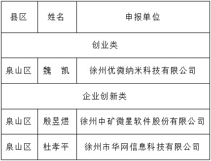 当前位置:首页 > 其他栏目 > 园区新闻 徐州市公布2014年度“双创计划”第二批资助引进人才名单 发布者:cumtuspadmin 发布时间:2015-01-13 浏览次数:3601 近期,从徐州市人才办公室获悉,经市人才工作领导小组研究,报市委、市政府同意,矿大科技园3人获批2014年度徐州市“双创计划”第二批资助引进人才项目。名单如下:2014年度徐州市“双创计划”第二批资助引进人才名单