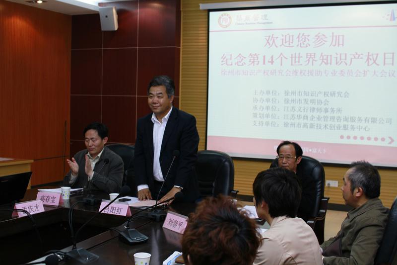 为了促进国家知识产权示范市的创建,提高企业的知识产权?;ひ馐?,充分宣传和发挥知识产权?;ぴ谔岣咂笠底灾鞔葱禄疃械淖饔茫熘菔兄恫ㄑ芯炕崃现泄笠荡笱Ч掖笱Э萍荚?、徐州市发明协会、江苏华商企业管理咨询服务有限公司、江苏义行律师事务所、徐州市高新技术创业服务中心等单位,于4月26日下午,在矿大科技园共同举办了第十四个世界知识产权日宣传咨询活动——徐州市知识产权研究会维权援助专业委员会扩大会议。徐州市知识产权研究会维权专业委员会理事及企业代表40余人参加本次会议。