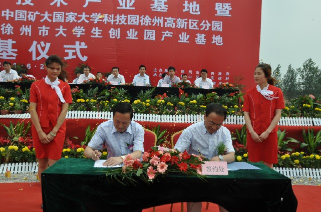 中国矿业大学国家大学科技园徐州高新区分园奠基前,中国矿业大学大学科技园有限责任公司总经理张福生和徐州高新区管委会副主任、副区长何长征签署了共建中国矿业大学国家大学科技园高新区分园合作协议。